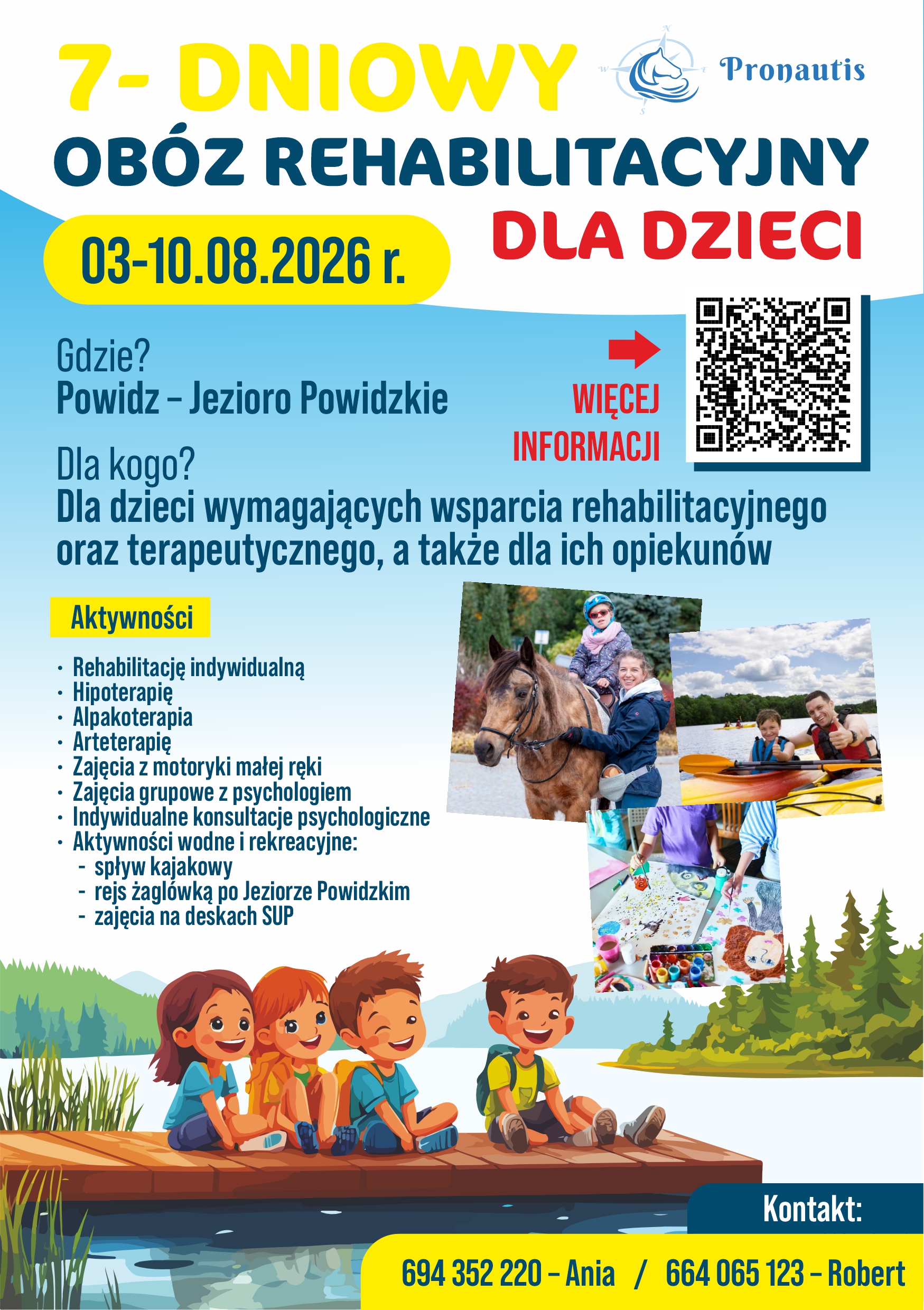 Zapraszamy dzieci wraz z opiekunami na wyjątkowy 7- dniowy obóz rehabilitacyjny, łączący profesjonalną terapię z aktywnym wypoczynkiem w otoczeniu przyrody. Program został przygotowany z myślą o holistycznym wsparciu rozwoju dziecka oraz regeneracji i wytchnieniu dla opiekunów.